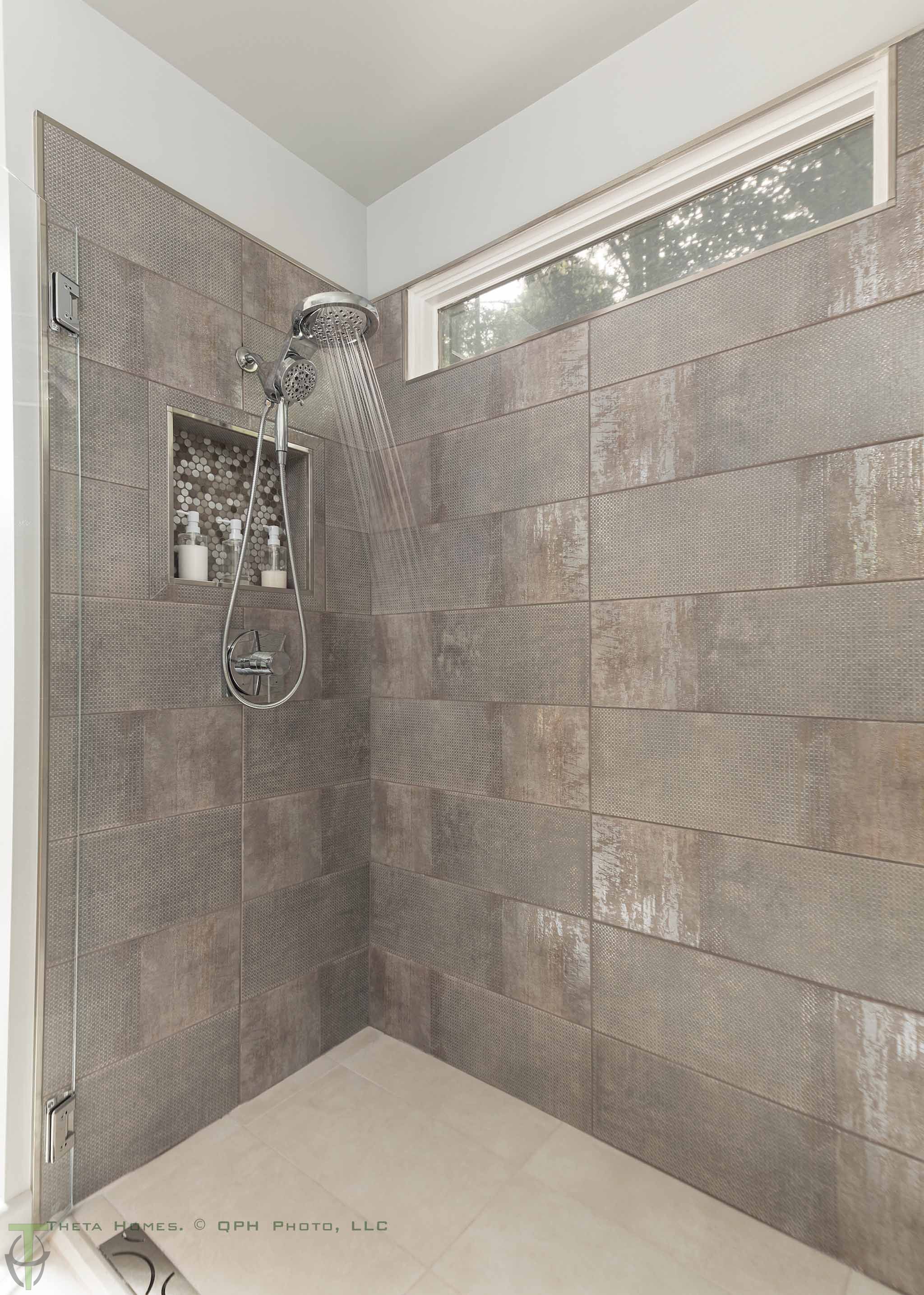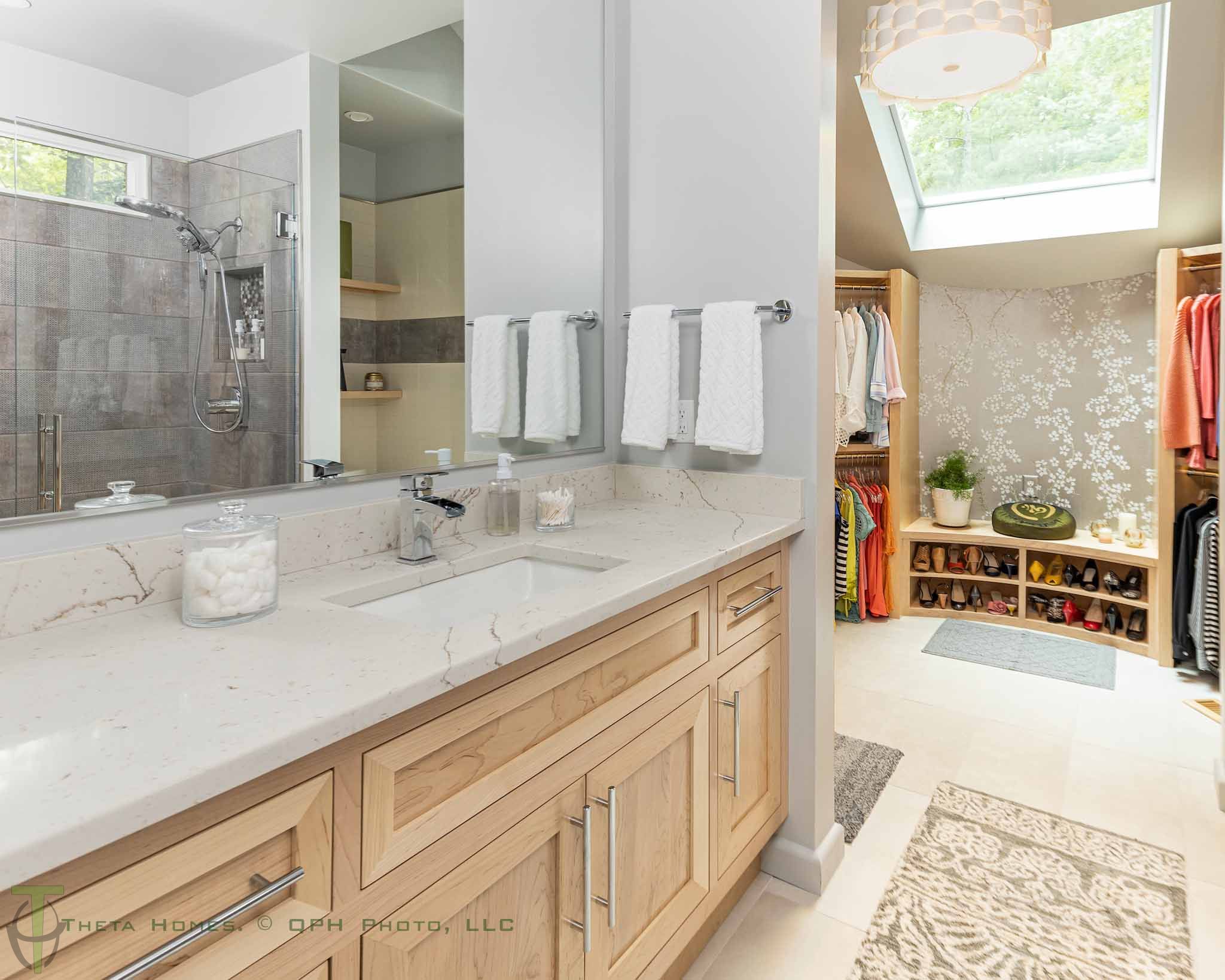 In the first phase, we remodeled the hall bath on the second floor. We expanded and increased functionality by incorporating a closet into the bathroom. Then, in the second phase, the owner moved to the second floor so we could remodel the master bathroom and other living areas on the first floor.