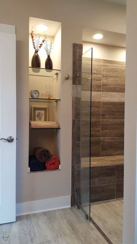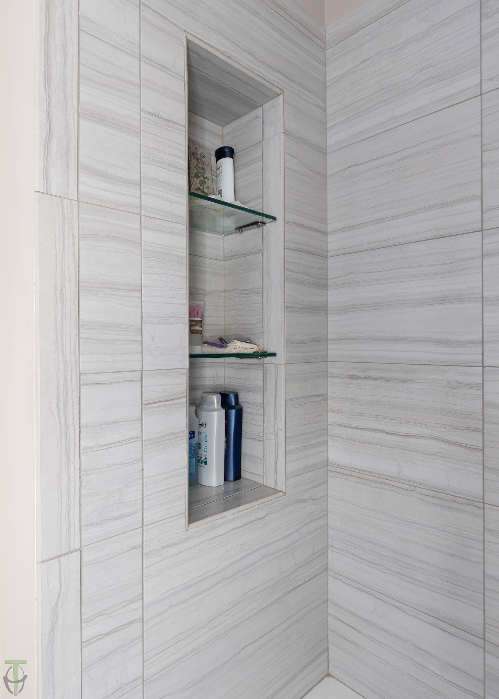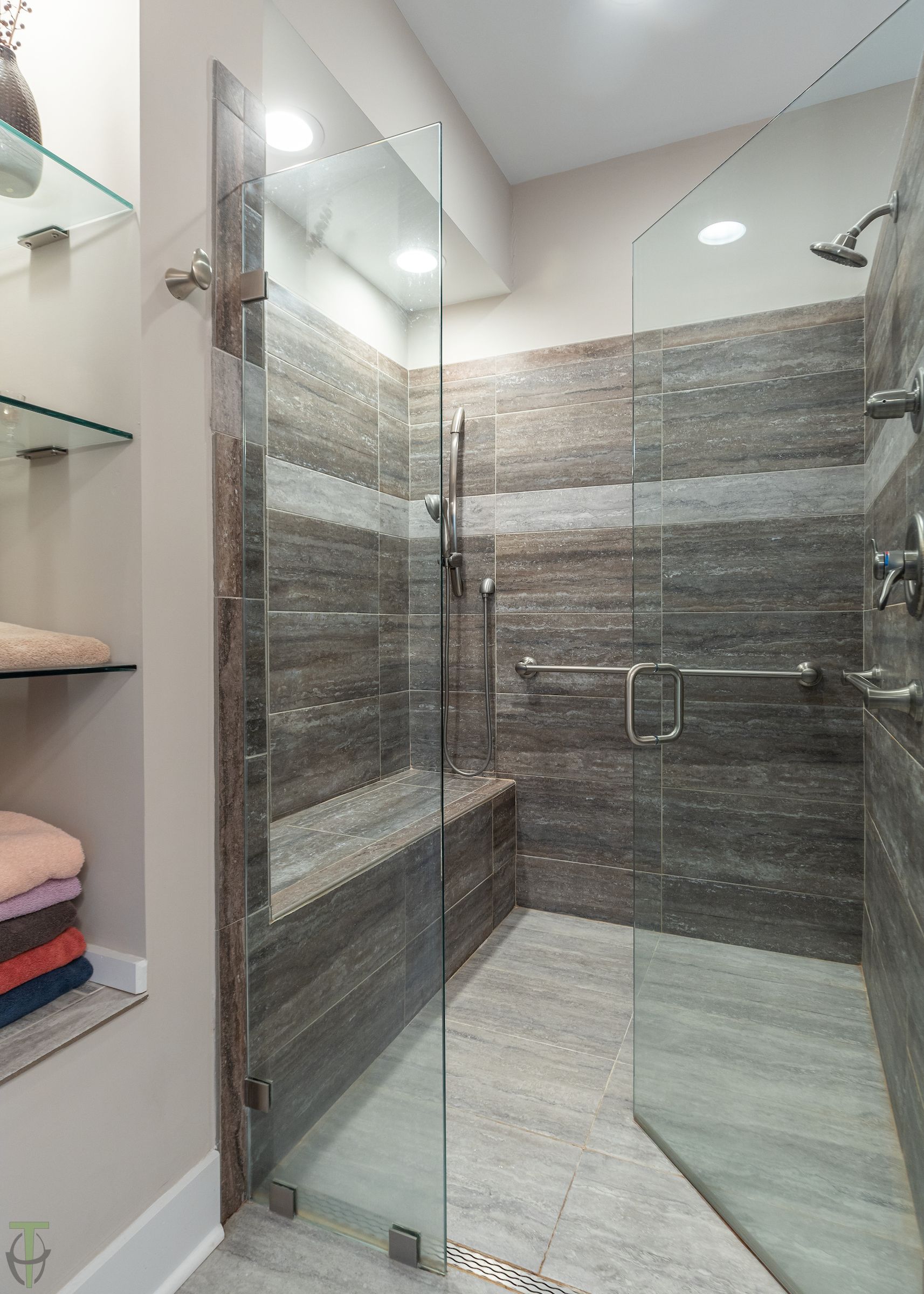 Master bath was designed to accommodate wheel chair access with curbless linear drain and expanded space for toilet with grab bars. Niches were created in the bathroom and in the shower area for display items and toiletries.