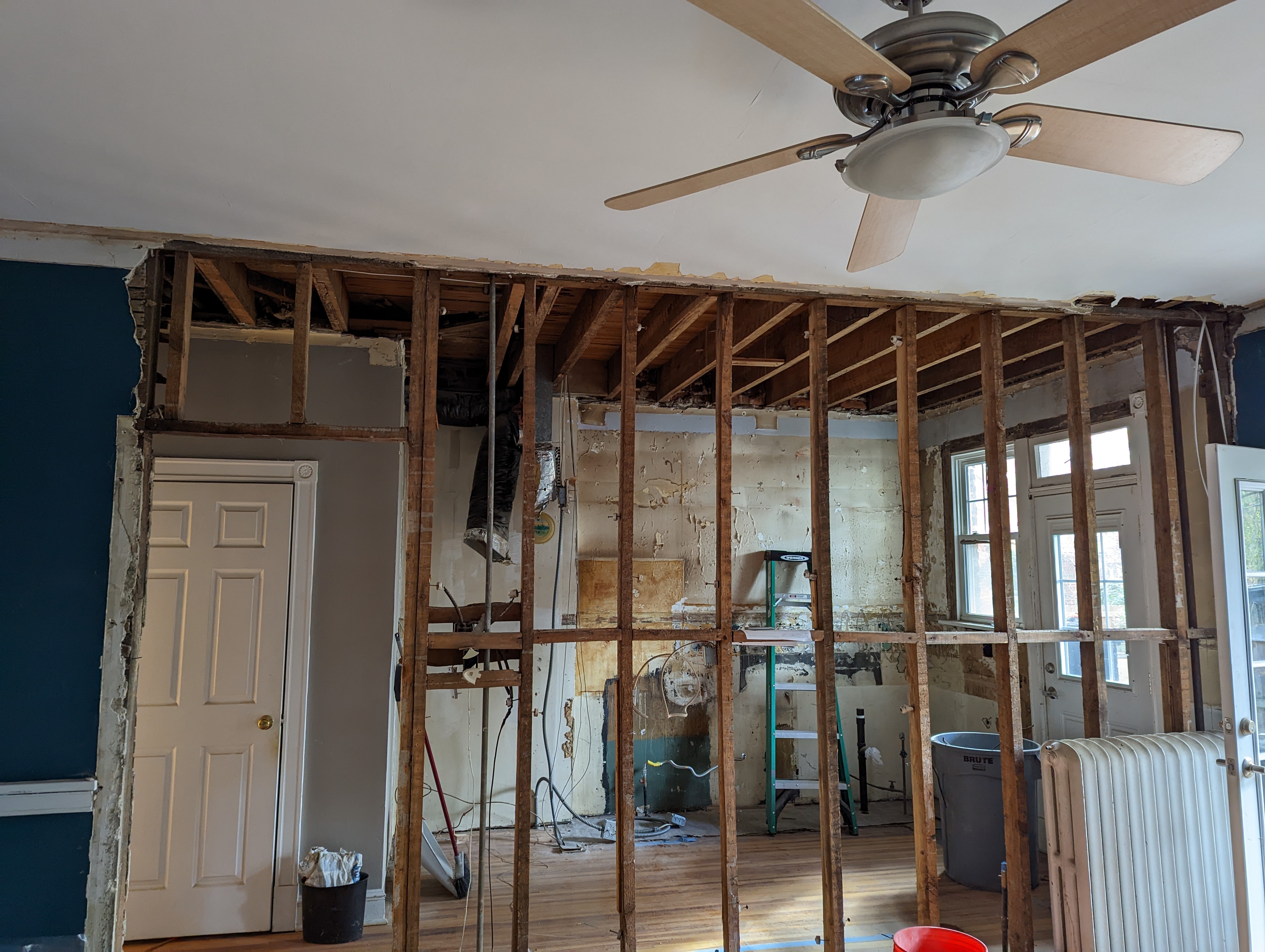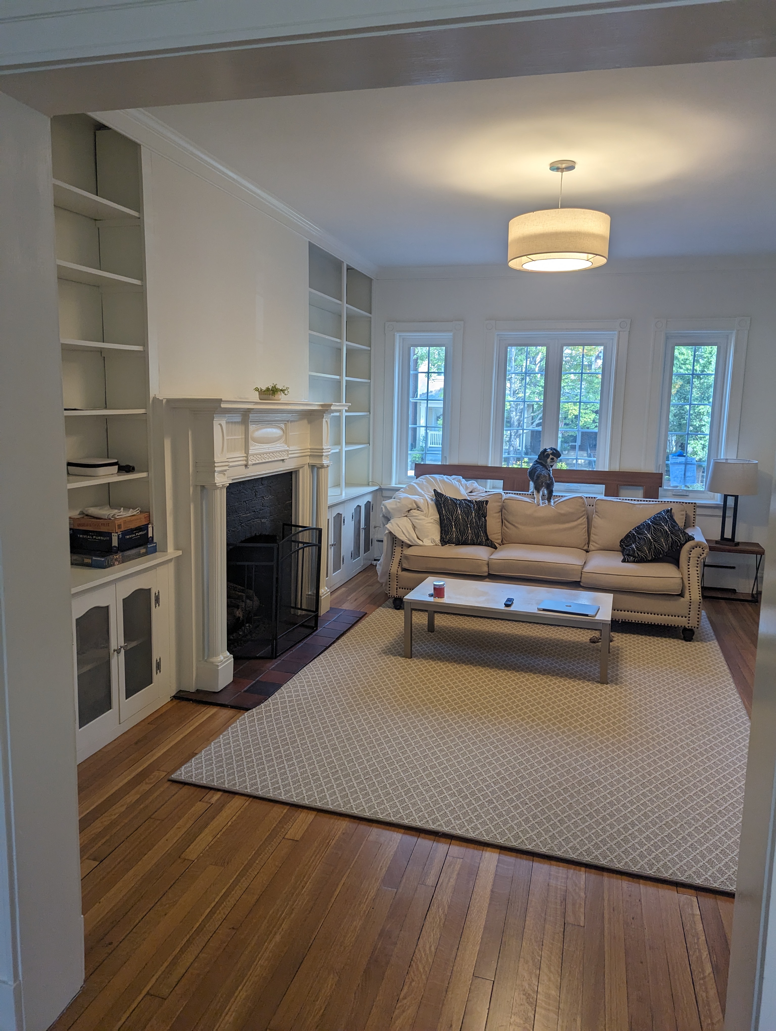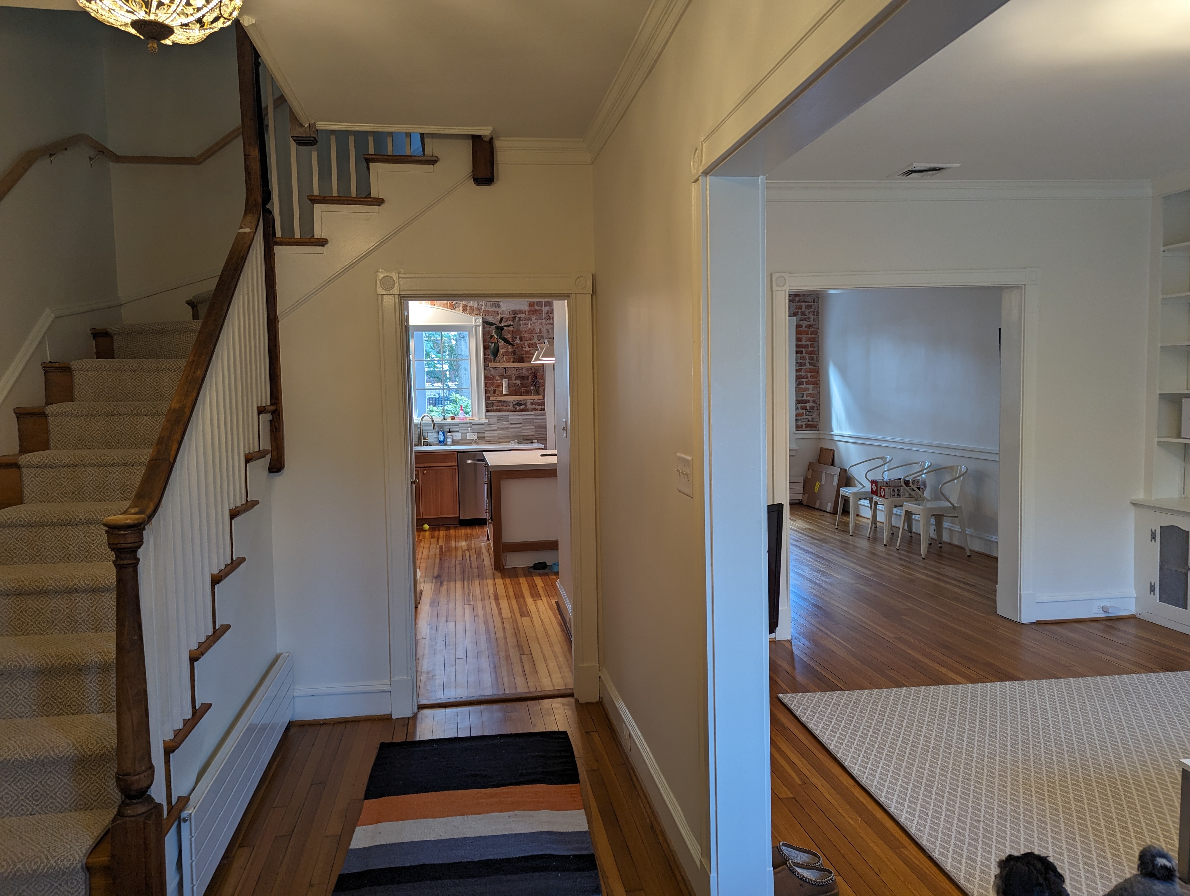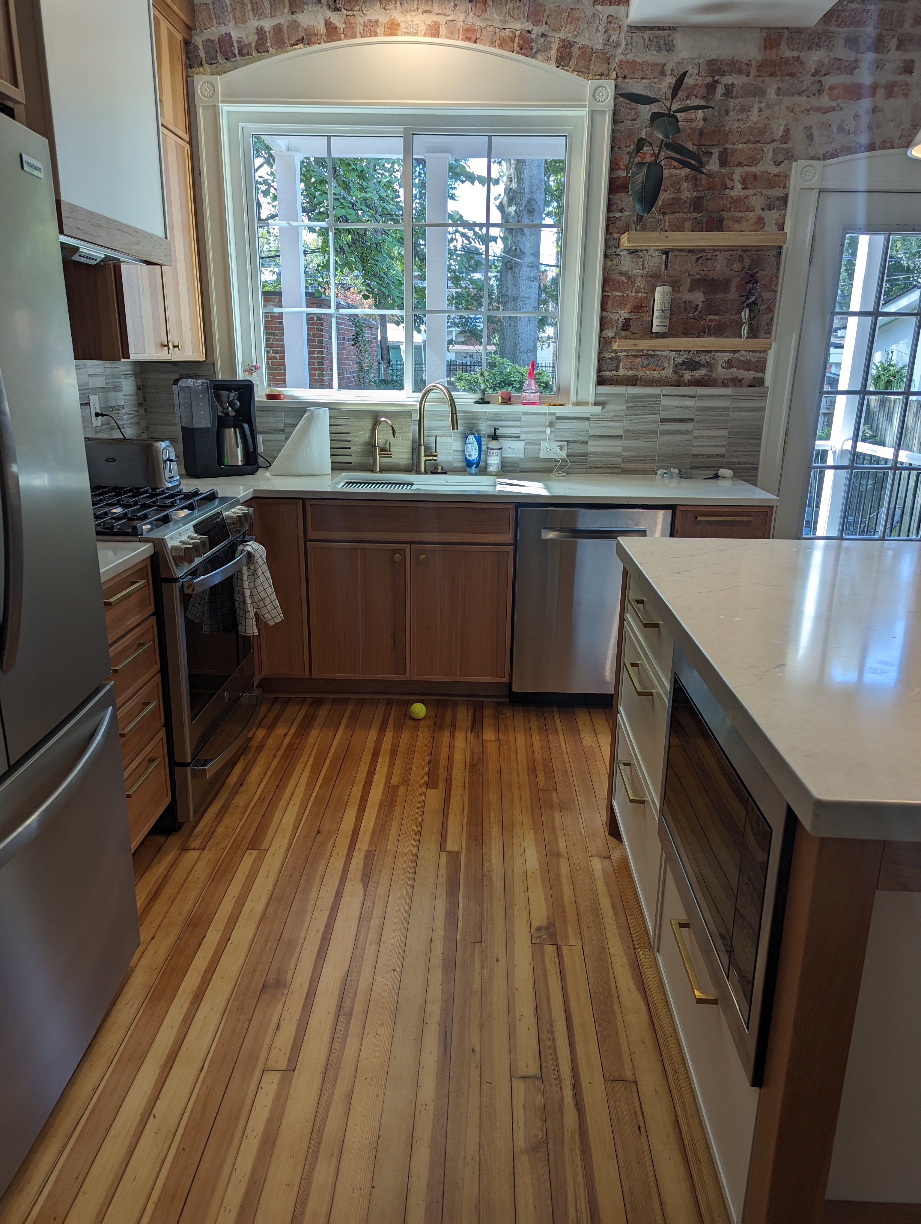 We worked with a Structural Engineer to install a new steel beam between Kitchen and Dining room that went above the ceiling so that the resulting ceiling between the two rooms is seamless. It was a challenging project but the result is a beautiful open room. The home looks much better in real life than the photos could capture.