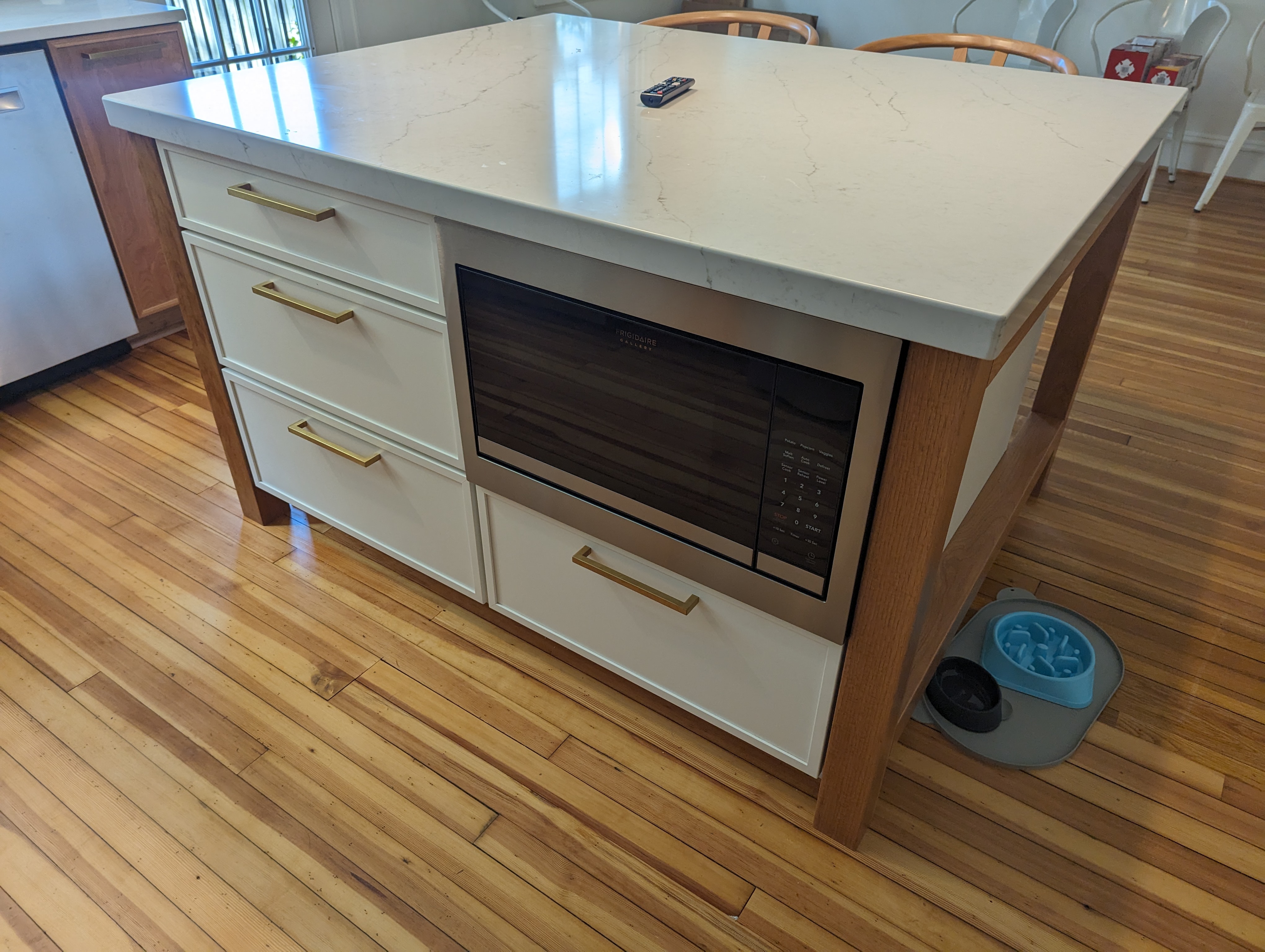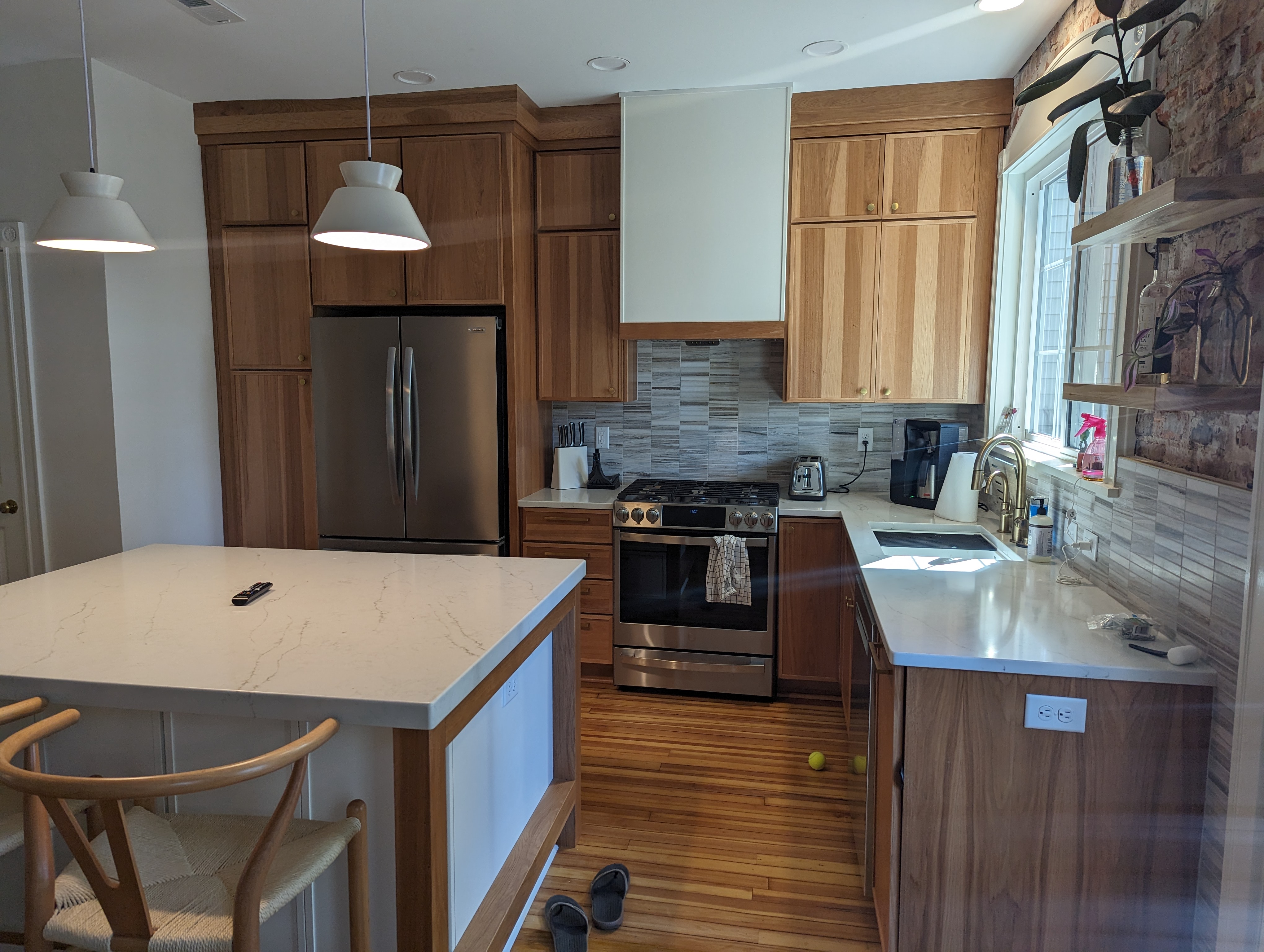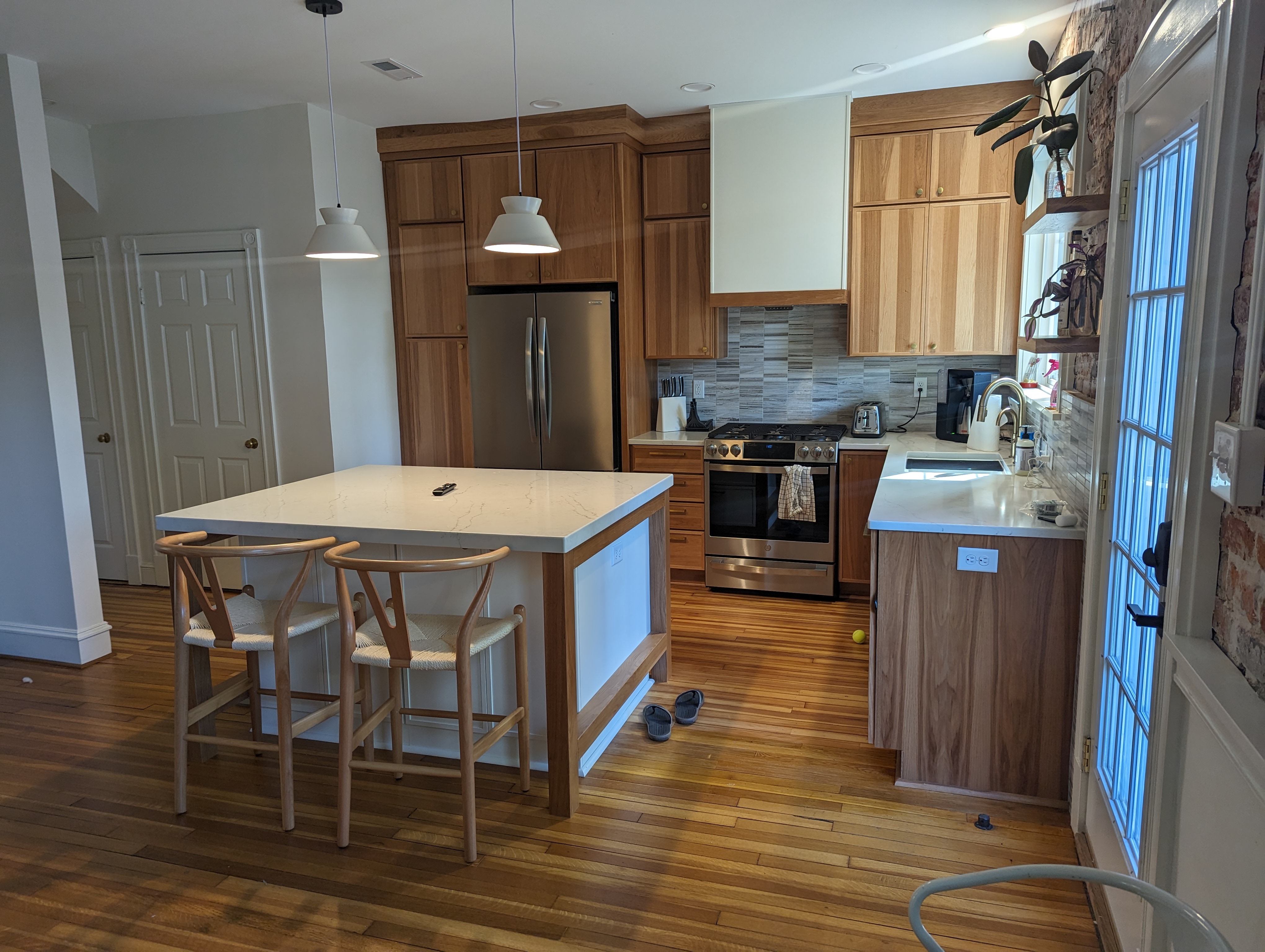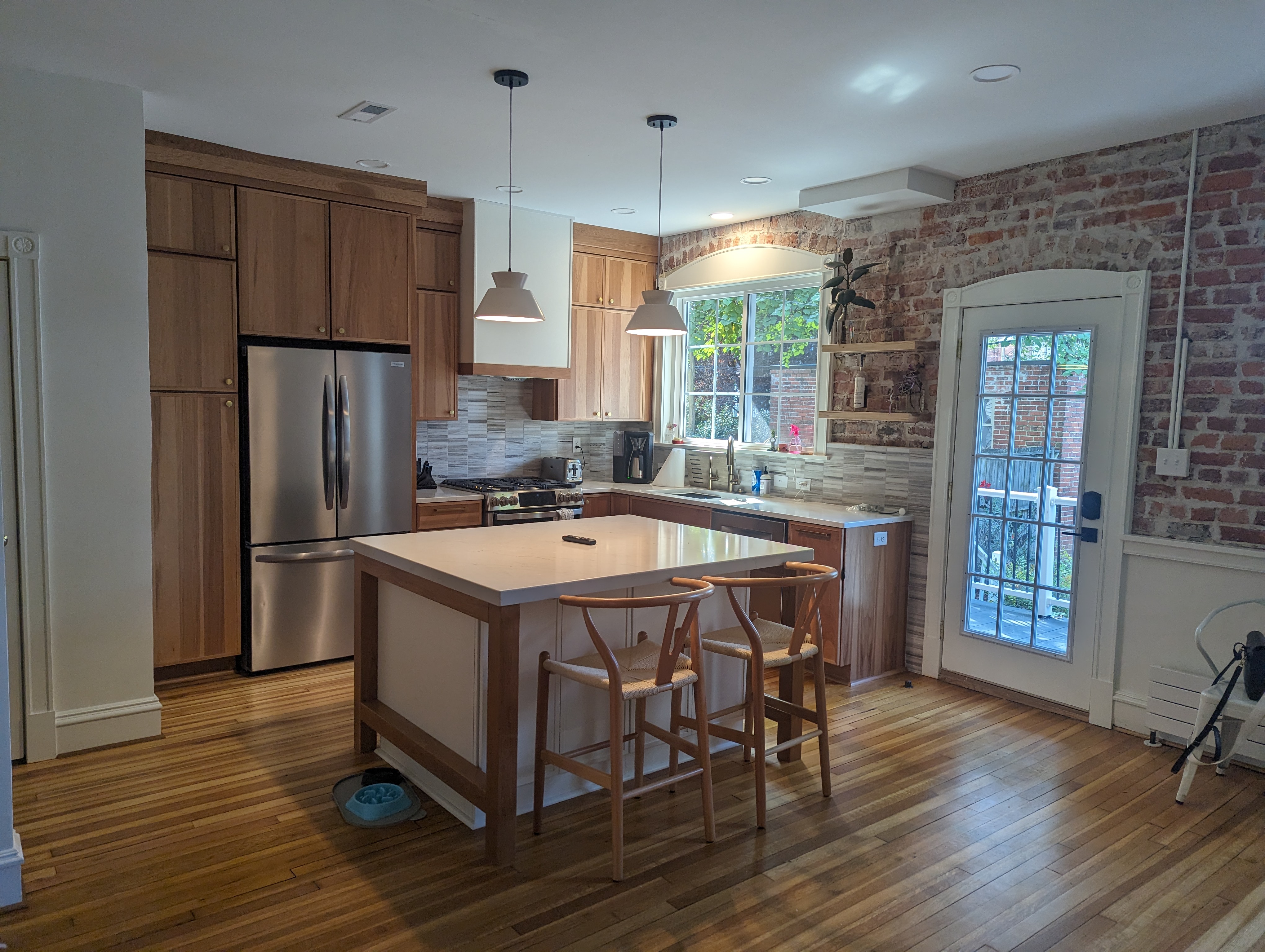We worked with a Structural Engineer to install a new steel beam between Kitchen and Dining room that went above the ceiling so that the resulting ceiling between the two rooms is seamless. It was a challenging project but the result is a beautiful open room. The home looks much better in real life than the photos could capture.