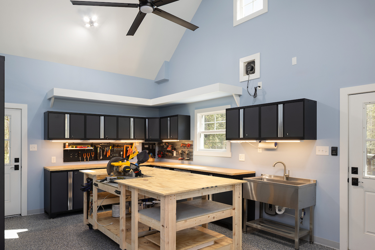 A Workshop addition that compliments the look of the existing home. About 2/3rd of the space is used for wood working and the rest for storing garden equipment, but owners placed a ping-pong table to enjoy some game time after a hard days work. The scope included:
